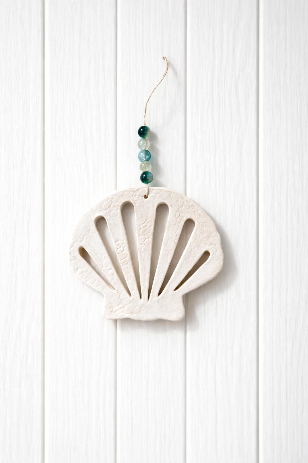 Crafted from textured white clay and shaped into a classic scallop shell silhouette, this piece features delicate cut-out detailing that adds dimension and shadow. The natural twine hanger is accented with ocean-inspired glass beads in shades of teal and seafoam, creating a subtle pop of coastal color.