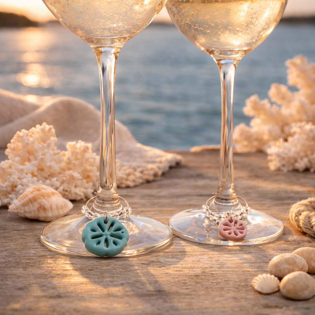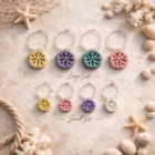 Elevate your coastal entertaining with these ceramic wine charms by Studio Jae Ceramics. Featuring handcrafted sand dollar designs in our exclusive Salty Girl coastal palette, each charm adds a soft pop of seaside color to your glassware.