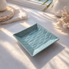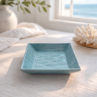 Finished in our signature Seaglass Blue glaze, this 3.5” x 3.5” square dish features a subtle embossed fish pattern that catches the light beautifully in bright coastal spaces. Its compact size makes it perfect for salt, jewelry, keys, rings, dipping sauces, or styling on open shelving.