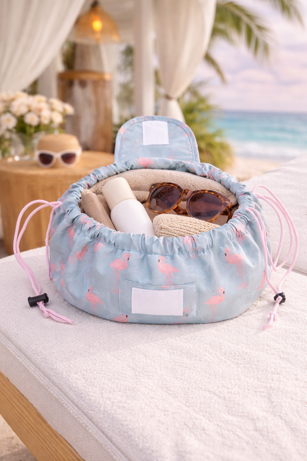 Designed in a soft coastal blue with playful pink flamingos and subtle palm detailing, this lightweight drawstring pouch keeps your must-haves secure without sacrificing style. The structured base and adjustable pink cord closure make it easy to open, fill, and cinch closed in seconds.