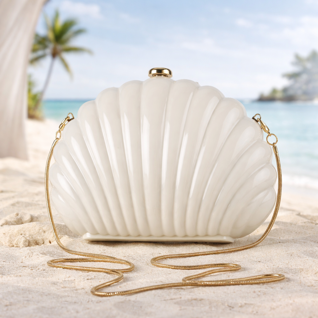 The Siren Shell Crossbody Clutch in Coconut Colada is your go-to neutral with a tropical twist. This glossy white shell design evokes soft sands and sunlit shorelines, finished with a refined gold clasp and detachable chain strap for versatile styling.